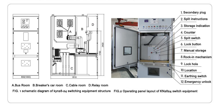 KYN28-24 switchgear is made up of two parts: the cabinet body and movable part (commonly known as handcart). The cabinet is divided into several functional compartments with metal partitions, such as bus bar room, circuit breaker room, cable room and relay instrument room.