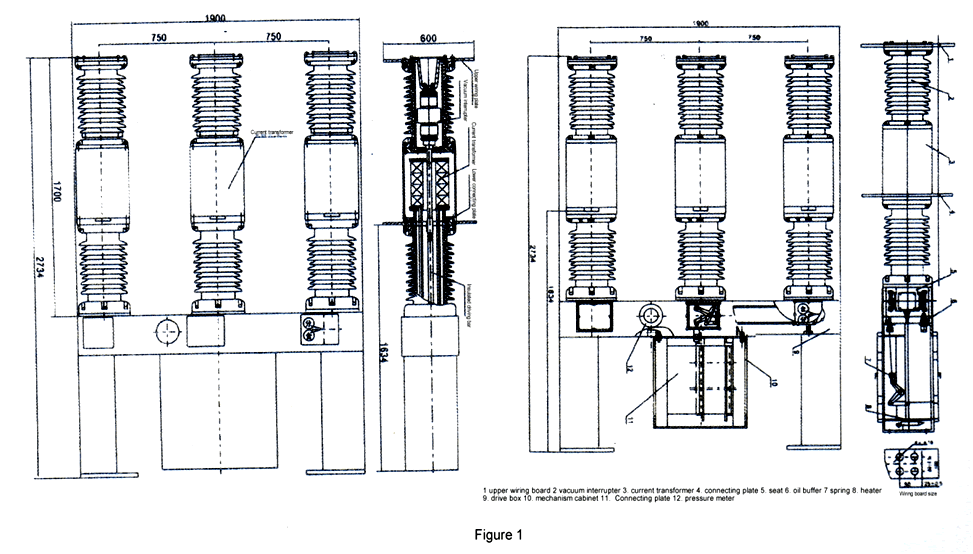 The breaker is generally composed of upper porcelain bushing, lower porcelain sleeve, low rack and operation mechanism. Vacuum interrupter is installed in upper porcelain bushing, and arc extinguishing chamber is made of ceramic shell and exposed stainless steel shielding cylinder, and contact is made of CUCR50 material and cup shaped longitudinal magnetic field. Bottom line of the circuit breaker uses a slider type intermediate contact, circuit resistance is small, and electrical conductivity is very good. Lower porcelain sleeve is insulation pillar, electric part is insulated to ground, and porcelain sleeve is equipped with a insulated pulling bar.