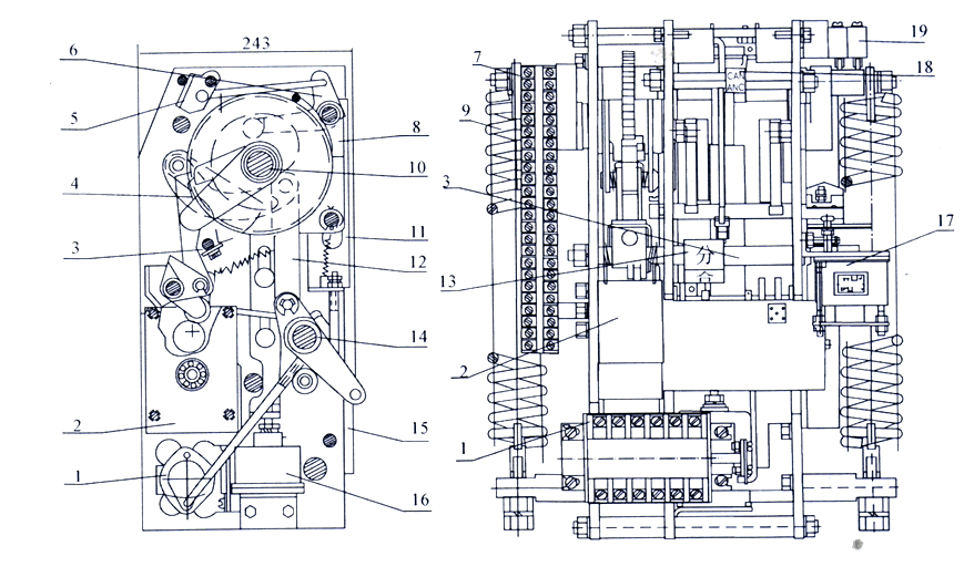 Circuit breaker gas charging instructions: the sealing structure is filled with 002MPA (20℃) SF6 gas (or high purity nitrogen) to ensure no condensation inside any climatic conditions. Because the product adopts high pressure sealing structure with excellent sealing performance, only 0.02MPA gas and internal and external pressure are quite close, so the possibility of leakage is completely eliminated. 0.02MPA (20℃) gas, not zero pressure meter gas (even if the product gas is zero pressure meter, still can ensure safe operation), one is to facilitate monitoring (can be read directly by the pressure meter), the two is to prevent low temperature negative pressure. When the ambient temperature exceeds (or below) 20℃, the pressure gauge reading is slightly larger than (or less than) the rated air pressure. For operation and maintenance, cocoa is also charged to 0.02MPA~0.04MPA without affecting the performance of the product. The CT19 spring operating mechanism used for circuit breaker is shown in Figure 2. The electrical principle of the mechanism is shown in Figure 5.